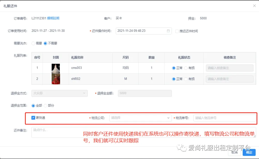 同时客户采用邮寄方式还件,在还件的时候可以勾选寄快递,填写物流公司和物流单号即可