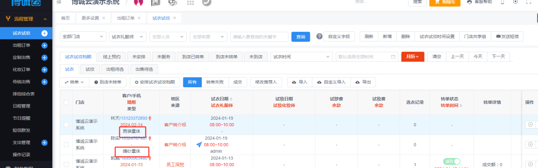 2、试衣类型:有些综合型礼服馆,用试衣时间点控制试衣量时,由于不同类型如婚纱、礼服、西装等使用时间不同,邀约安排时间后试衣间的利用率不好把控,通过试衣类型能够最大化的安排不同类型的客户,把现有资源利用最大化。