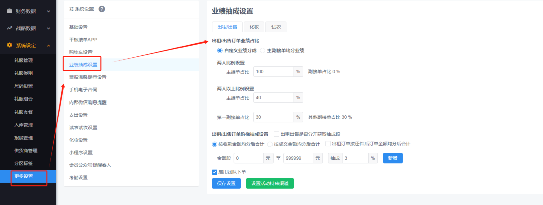 一、提前设置好业绩分配比例,多人接单可按需求设置百分比,如有按阶梯式的抽成方式亦可自行设置。