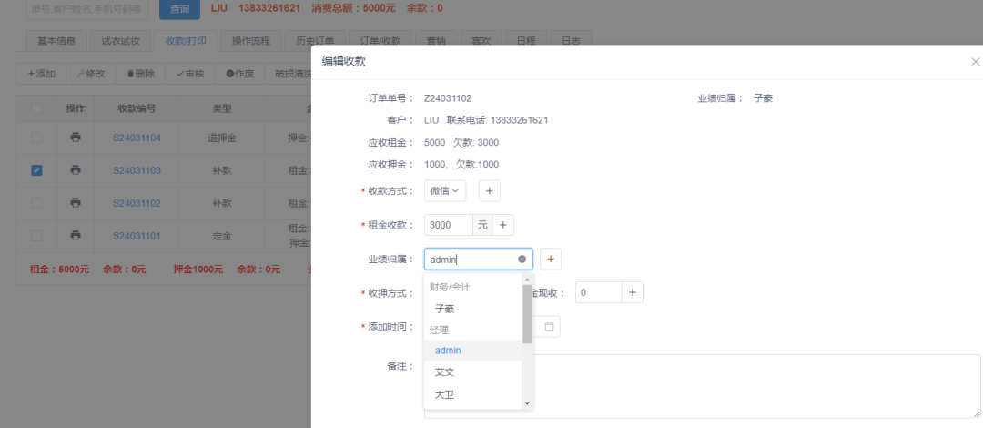 三、下完订单,如需调整业绩归属,可通过收款/打印中的收款记录进行修改。