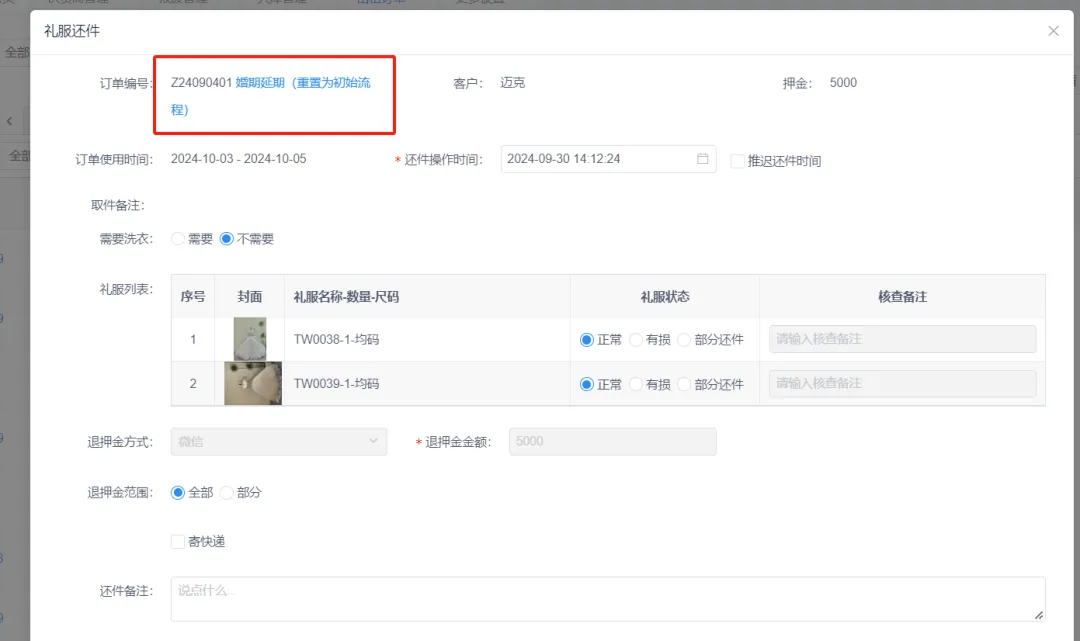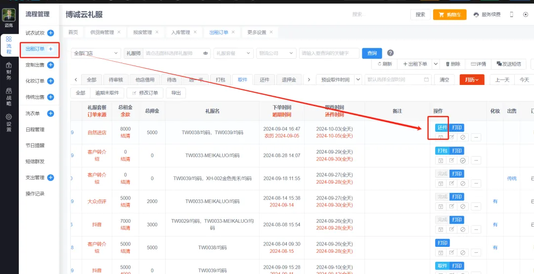 当遇到客户取件后婚期延期,在出租订单里面找到客户订单,点还件