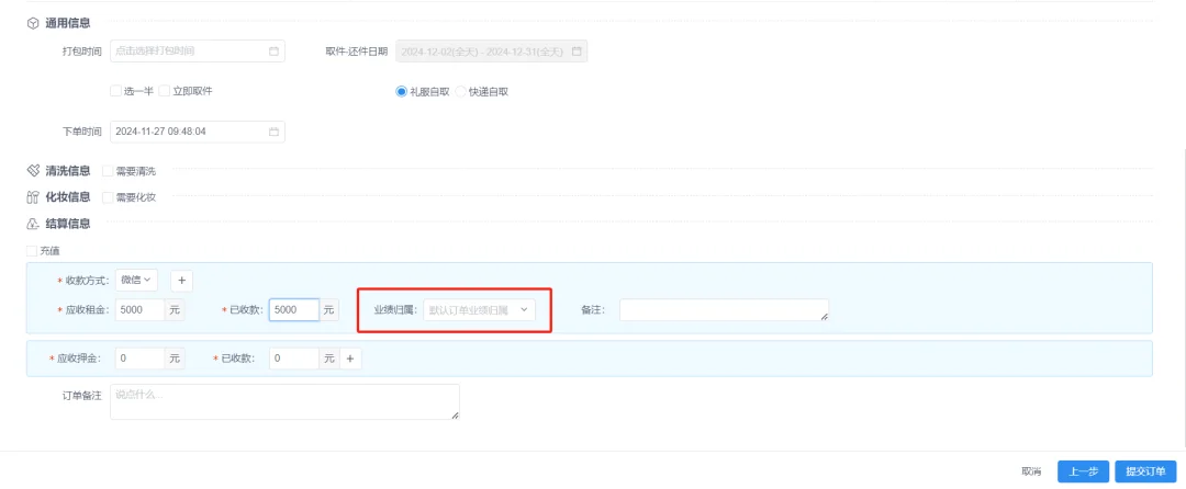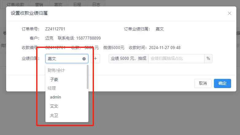 下单时直接划分业绩归属,输入金额系统会自动显示业绩归属(默认是该账号人)