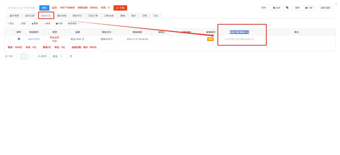 选择 收款/打印 ,点击业绩归属/抽成占比