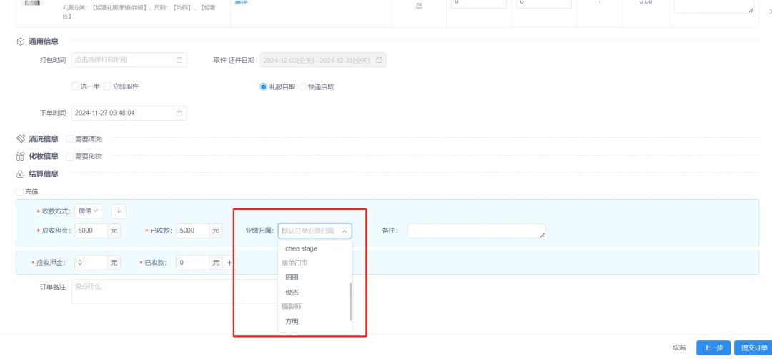 选择业绩归属人即可,抽成占比可不动,默认是原先在系统设置好的占比