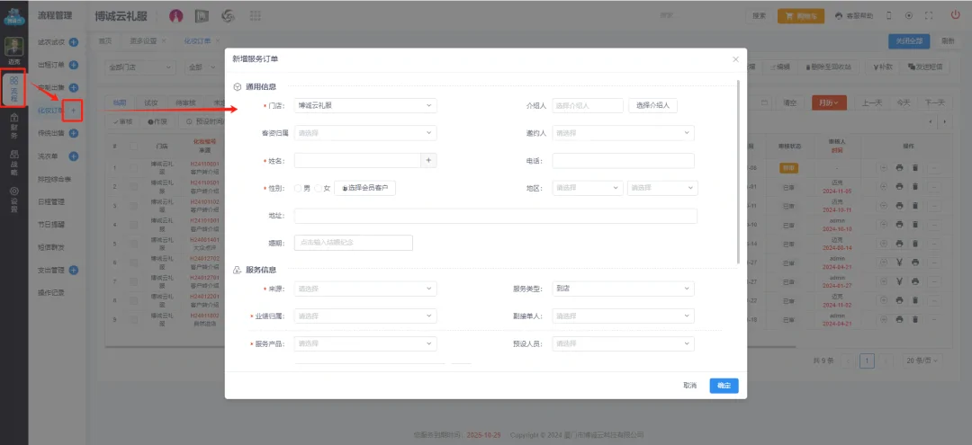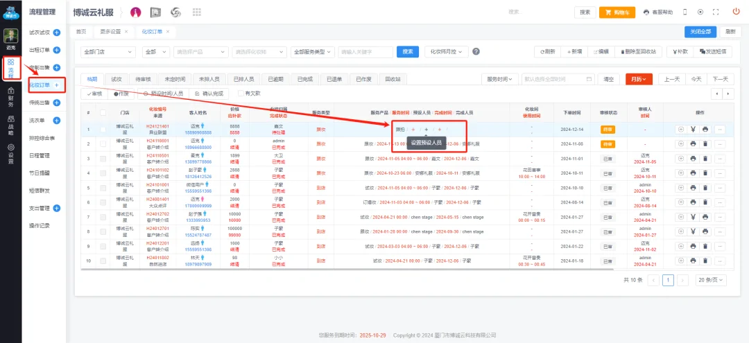 在化妆订单页面找到客户订单,在后方加号可直接按安排服务时间,服务人员