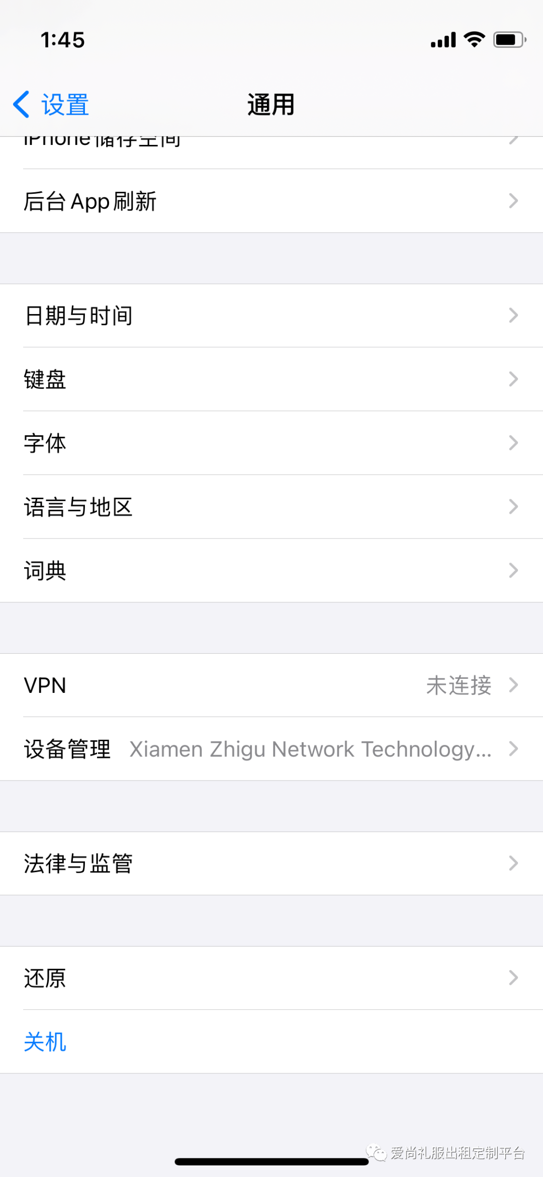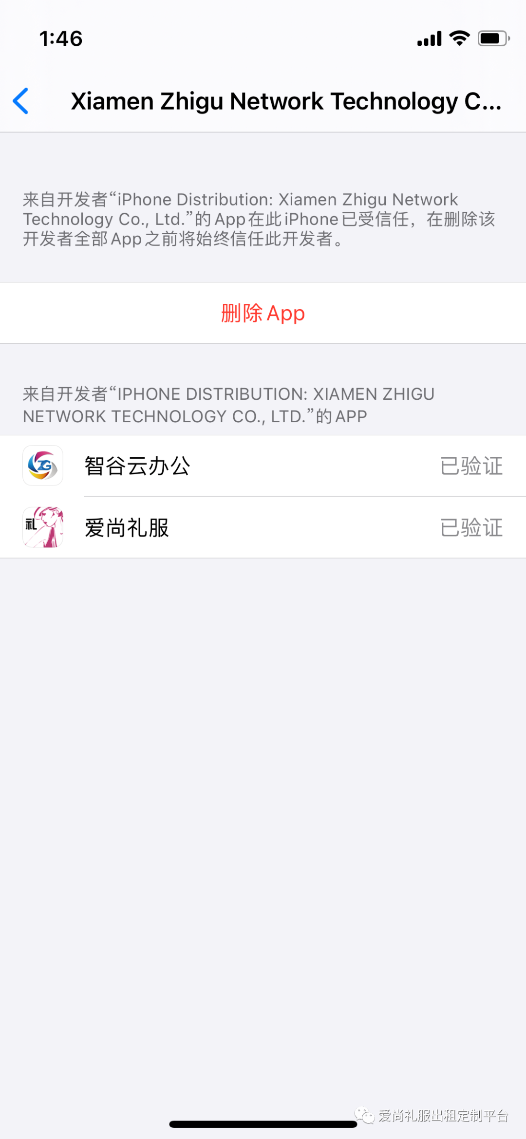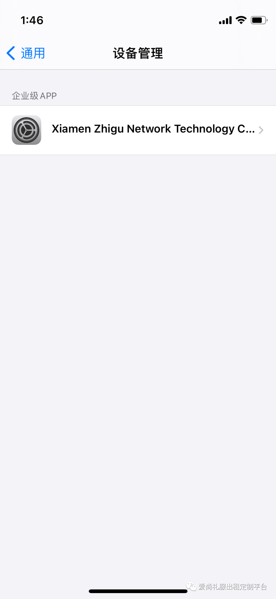 我们爱尚礼服APP端,安卓手机可以直接扫描APP二维码进行下载安装,那如果是苹果手机需要安装,需要用自带浏览器点开下载,下载完成以后会有一个需要完成APP信任,那么首先进入苹果设置页面通用,然后进入设备管理,选择要信任的APP完成信任。