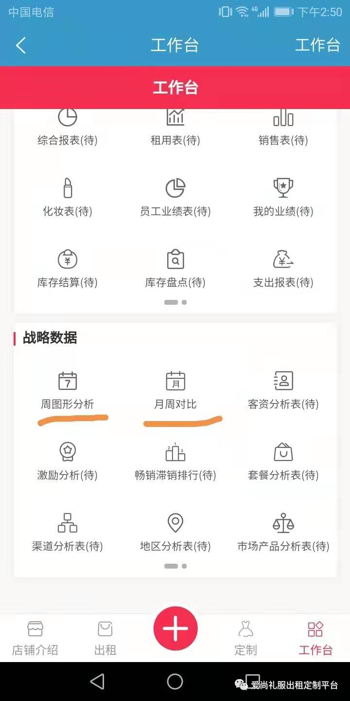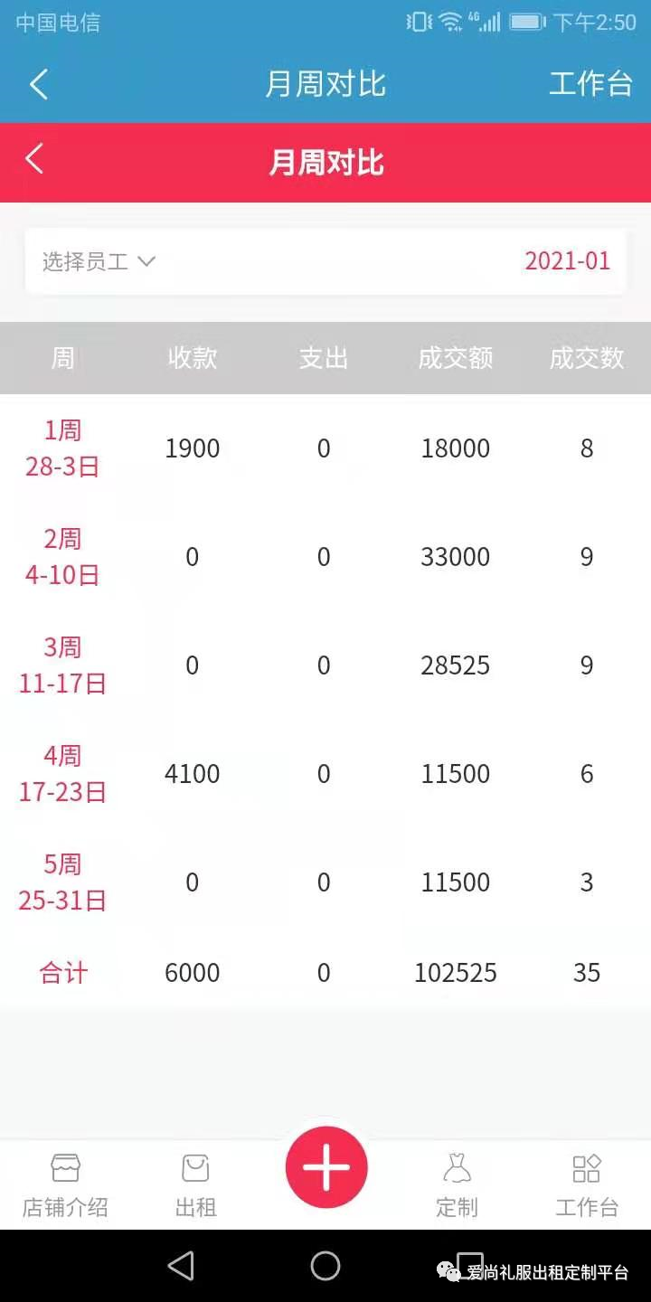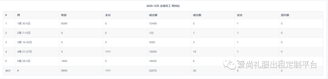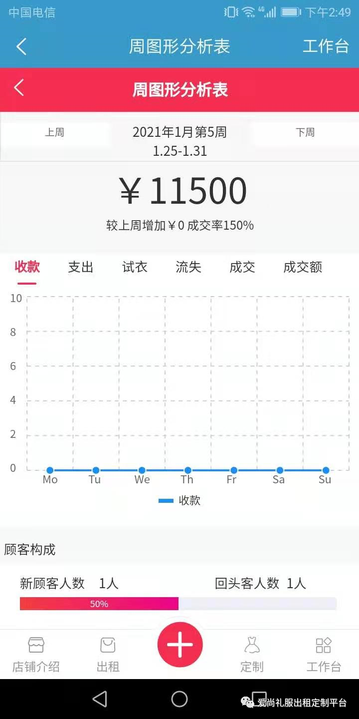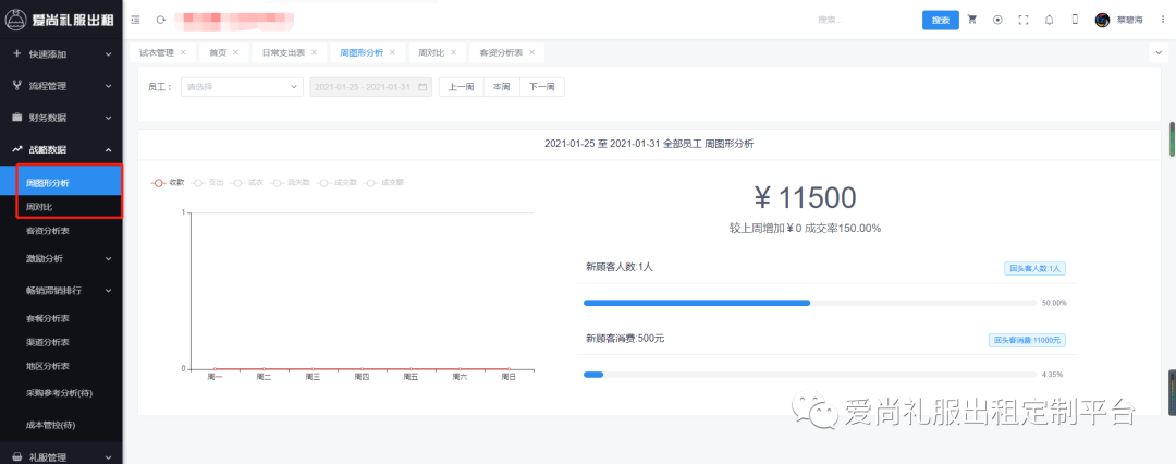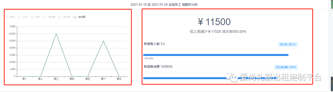 1.今天给大家分享爱尚礼服系统周图形表(收款、支出、试衣、流失数、成交数、成交额)